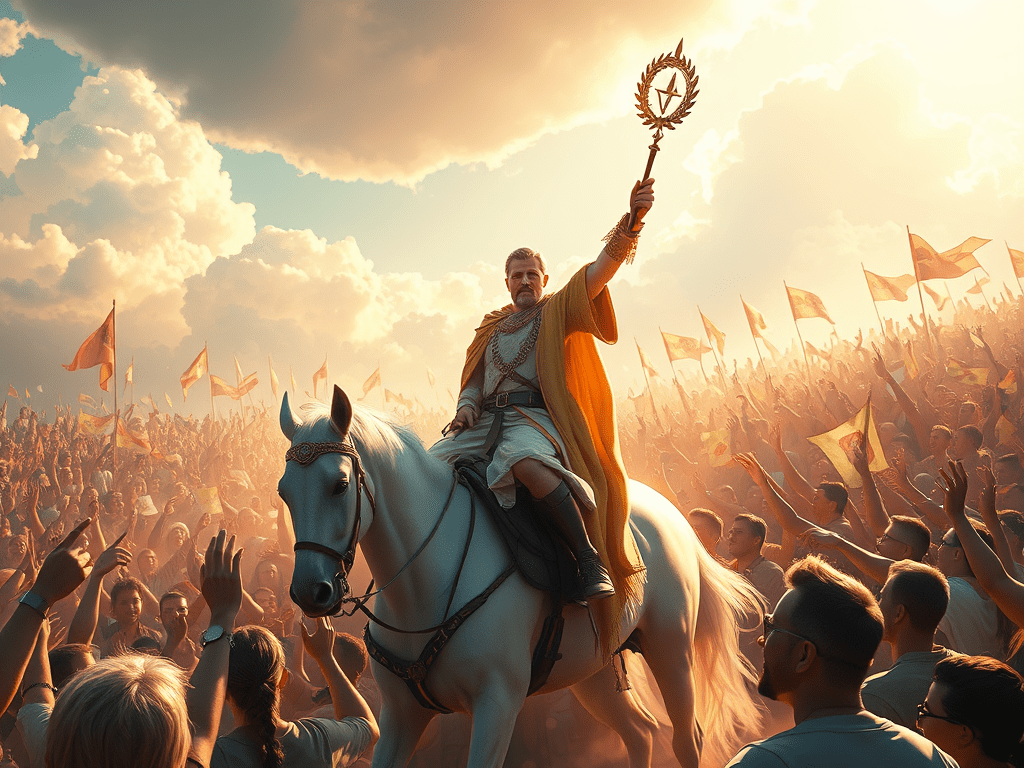 A rider on a white horse moves through a cheering crowd, holding a laurel-wreathed wand high. This card radiates victory, recognition, and public acclaim. The surrounding supporters symbolize collective celebration and acknowledgment of hard-won success.