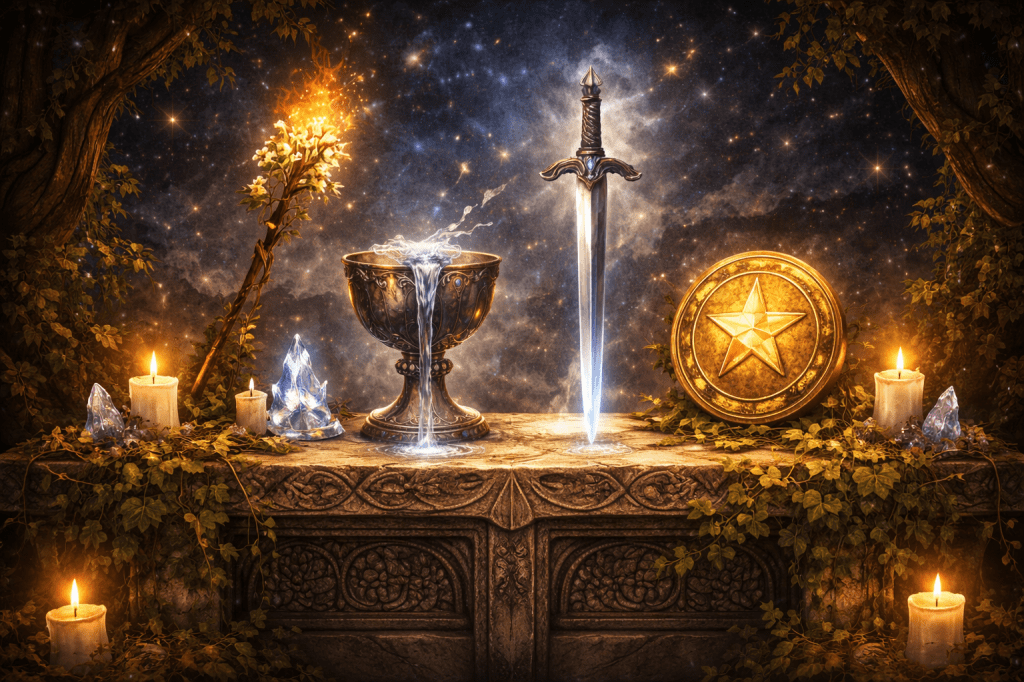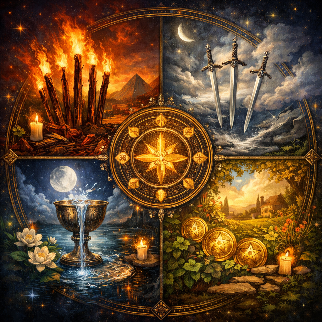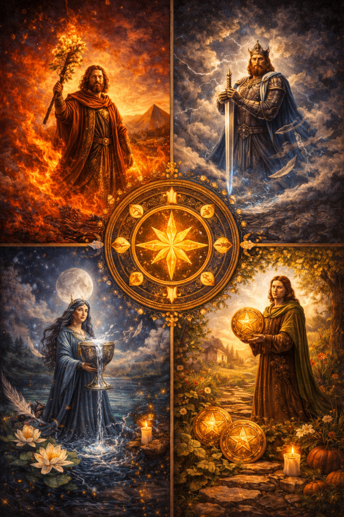 A symbolic guide to Wands, Cups, Swords, and Pentacles through the lens of elemental meaning, mythology, and storytelling